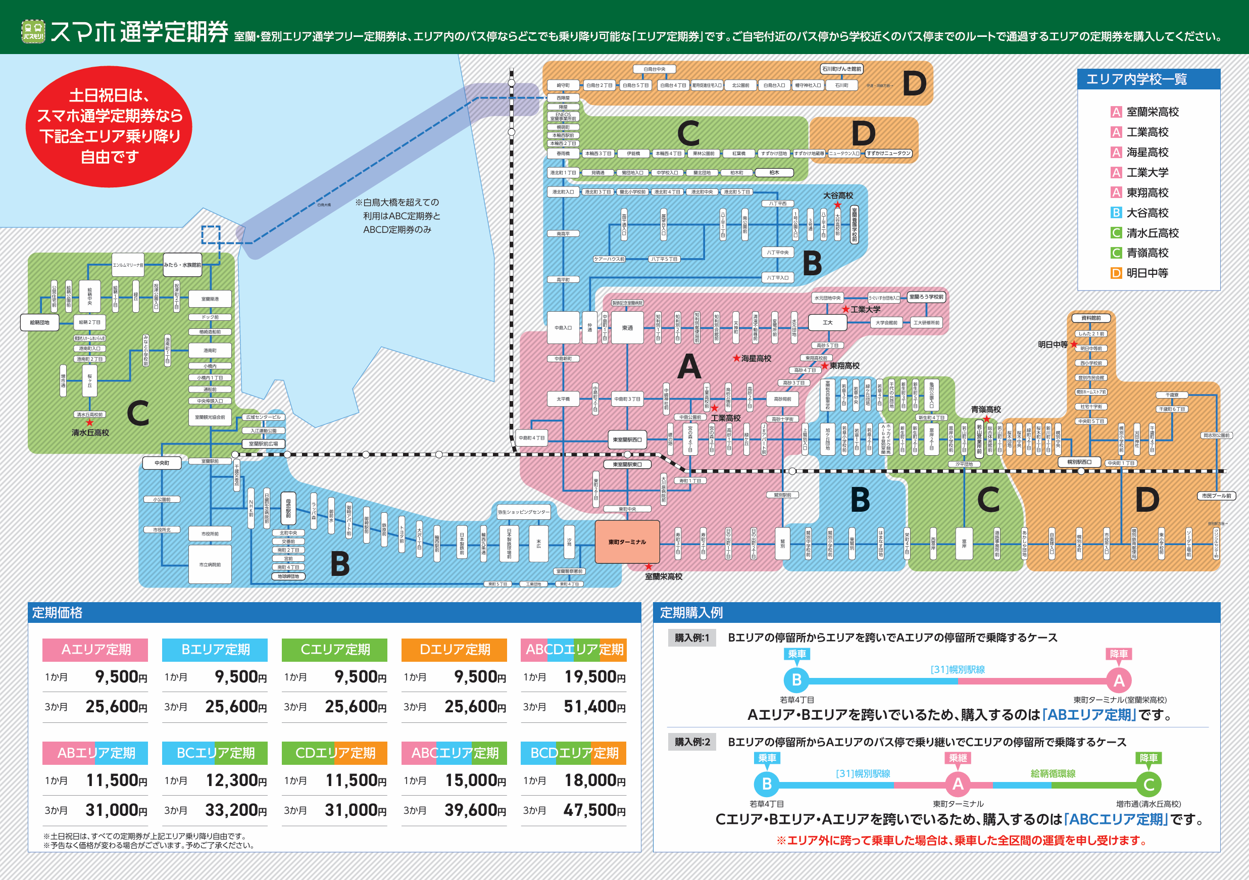 スマホ通学定期券は、土日祝日は選択したエリアに関わらず室蘭市内線のすべてのエリア(都市間バス・催事便などは除く)で乗り降りが自由となります。