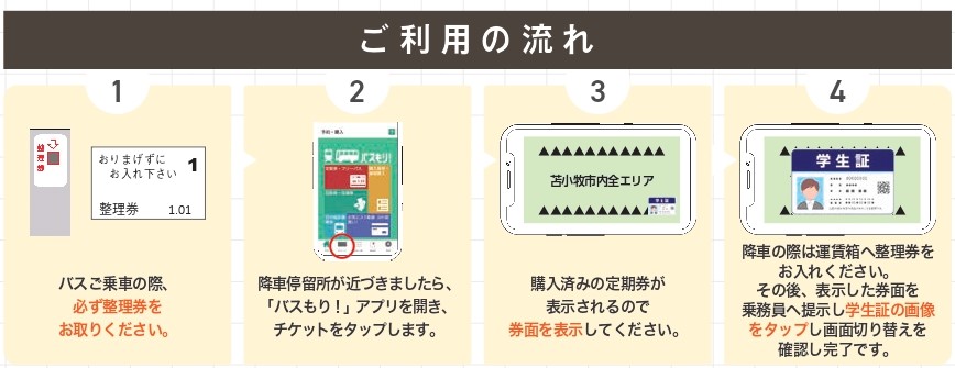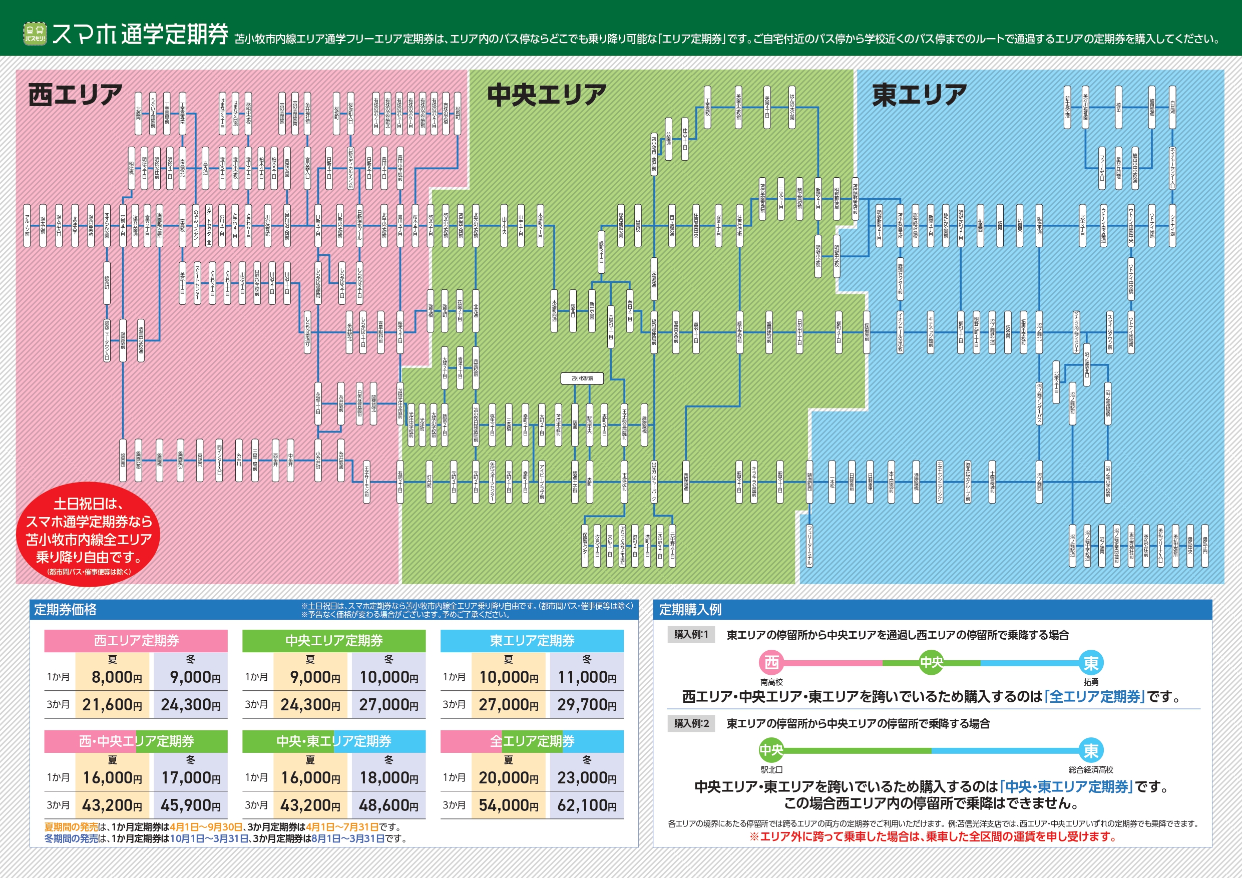 スマホ通学定期券は、土日祝日は選択したエリアに関わらず苫小牧市内線のすべてのエリア(高速バス・催事便などは除く)で乗り降りが自由となります。