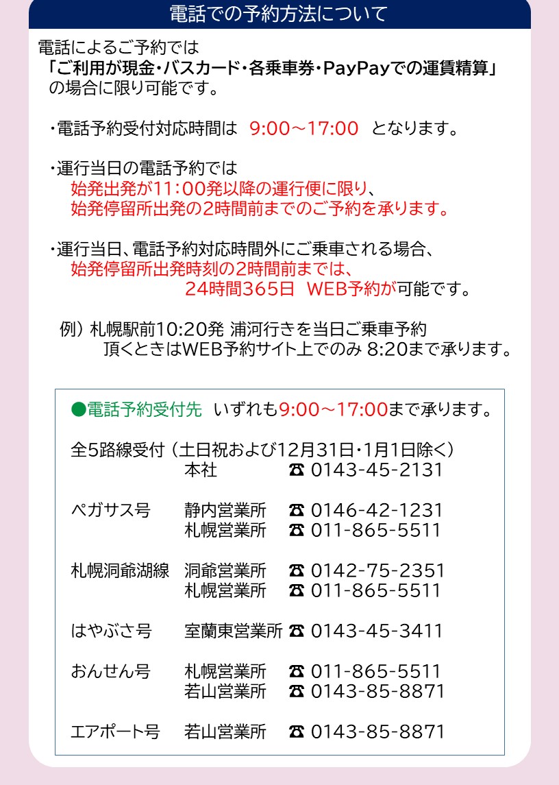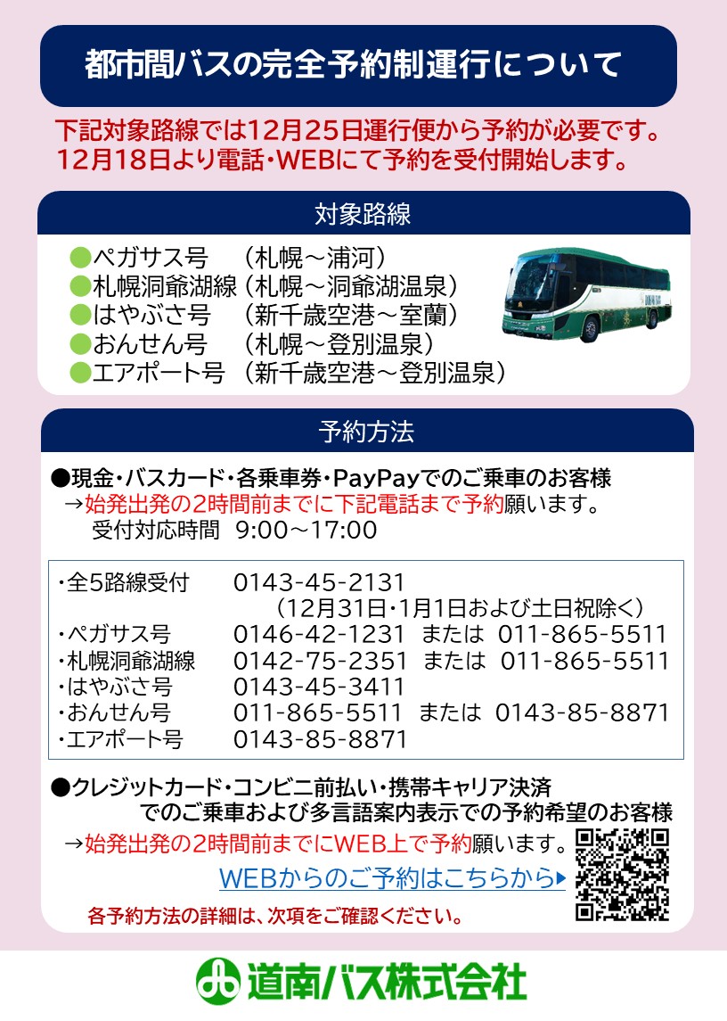12月18日より電話およびWEBページにて受付開始致します。乗車便の始発出発2時間前までにご予約をお願い致します。