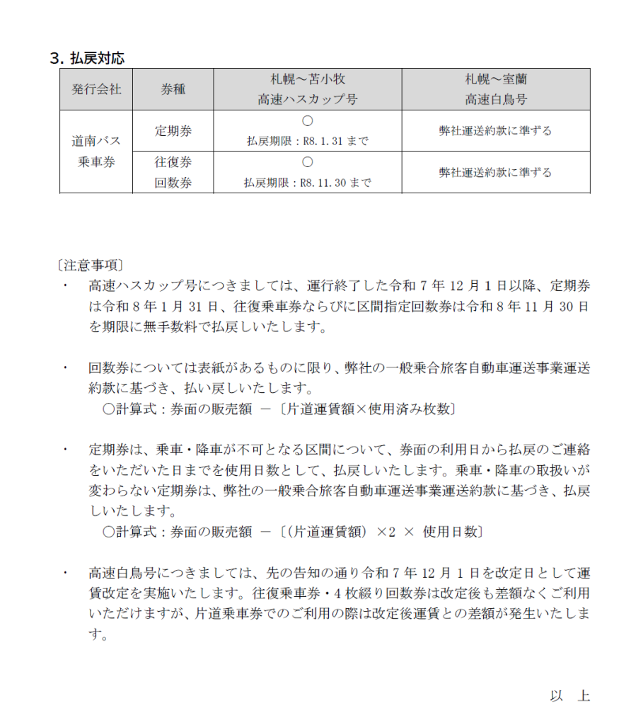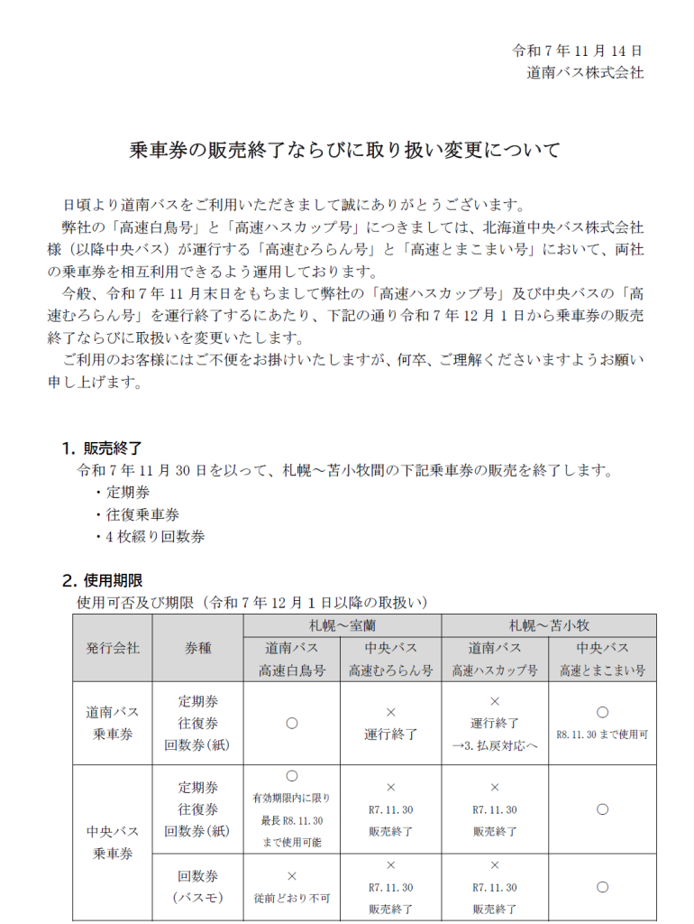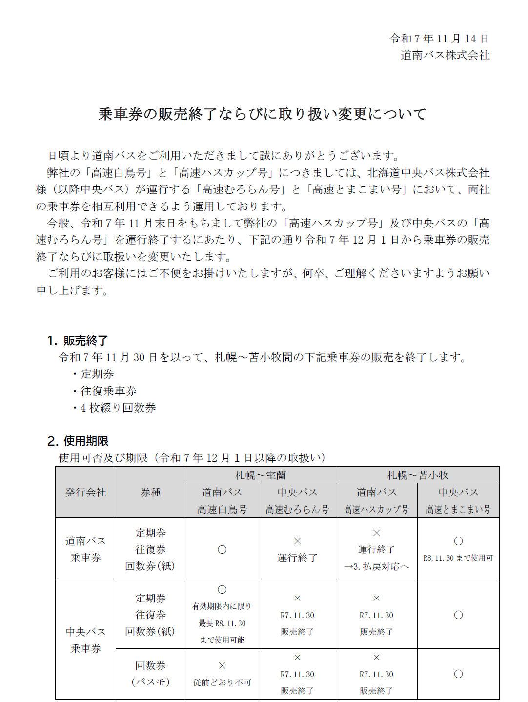 都市間高速バス廃止に伴う乗車券販売の終了ならびに取扱変更について
