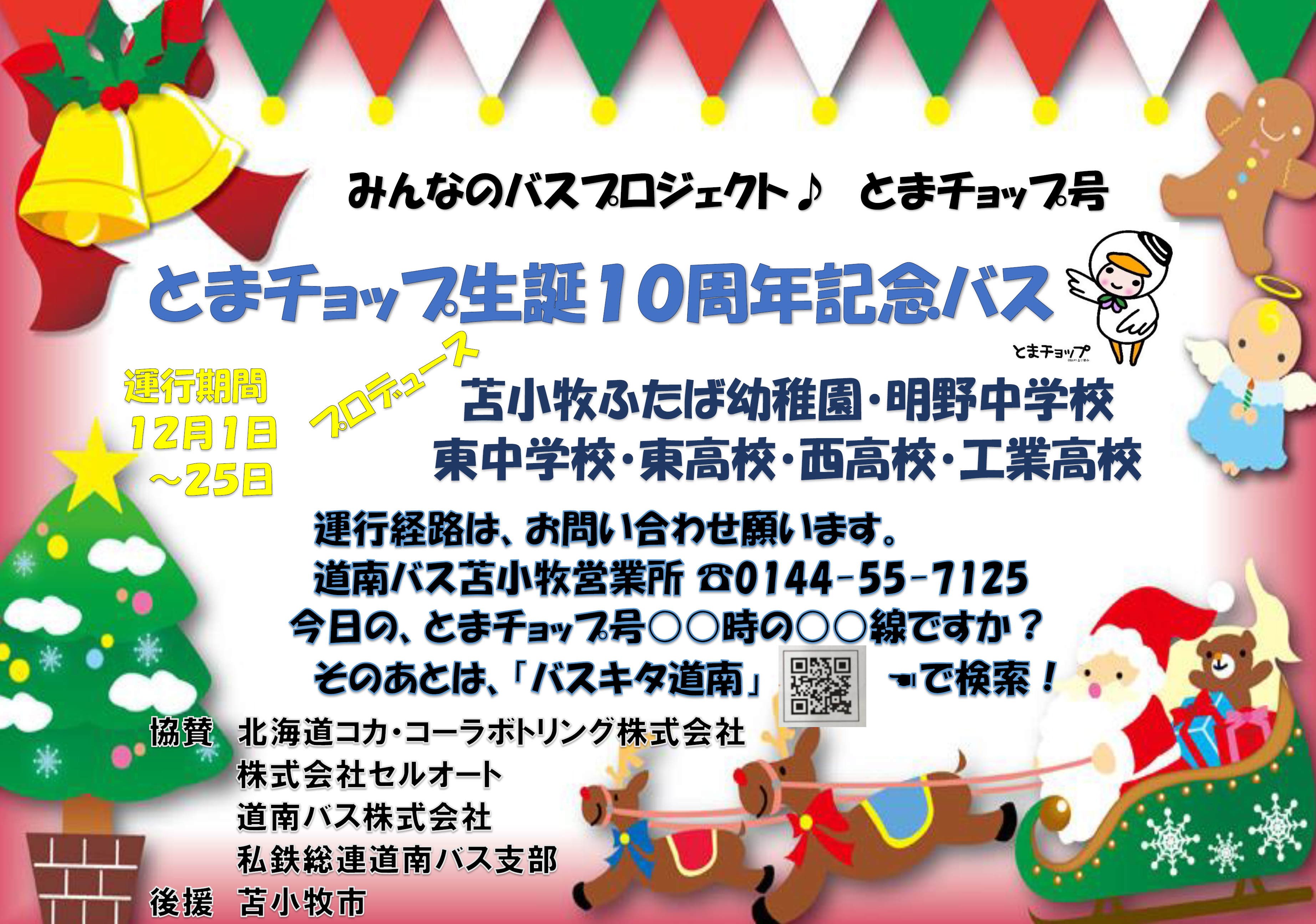 2021年12月1日~12月25日の間、苫小牧市内線にてデコレーションバスおよびイラストバスを運行します。 ・総経クリスバス 当日の運行経路は錦西営業所(0144-67-3100)にお問い合わせください。 ・とまチョップ号 当日の運行経路は苫小牧営業所(0144-55-7125)にお問い合わせください。