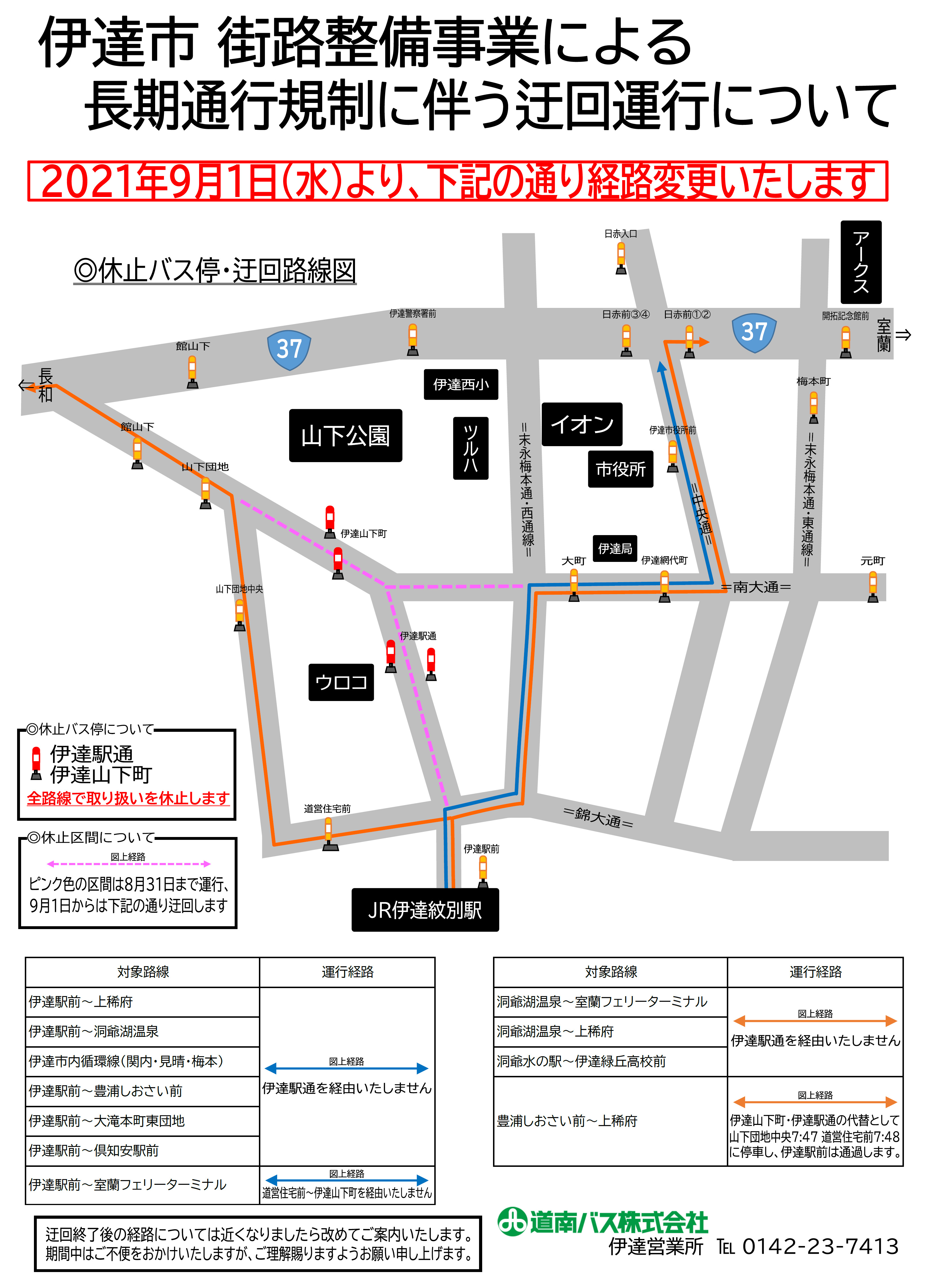 2021年9月1日始発便より、伊達市街路整備事業による工事通行規制のため 伊達駅前周辺の経路取り扱いを変更いたします。 これに伴い、「伊達駅通」・「伊達山下町」は供用休止とし、工事終了後の経路については改めてご連絡いたします。 詳細は下記をご覧ください。