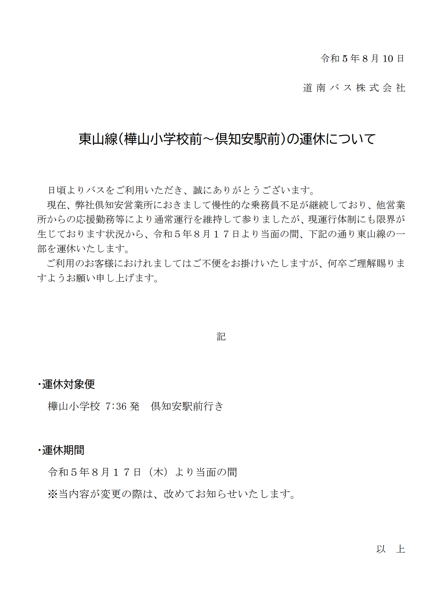 R5.8.17~ 東山線(樺山小学校~倶知安駅前)の一部運休について
