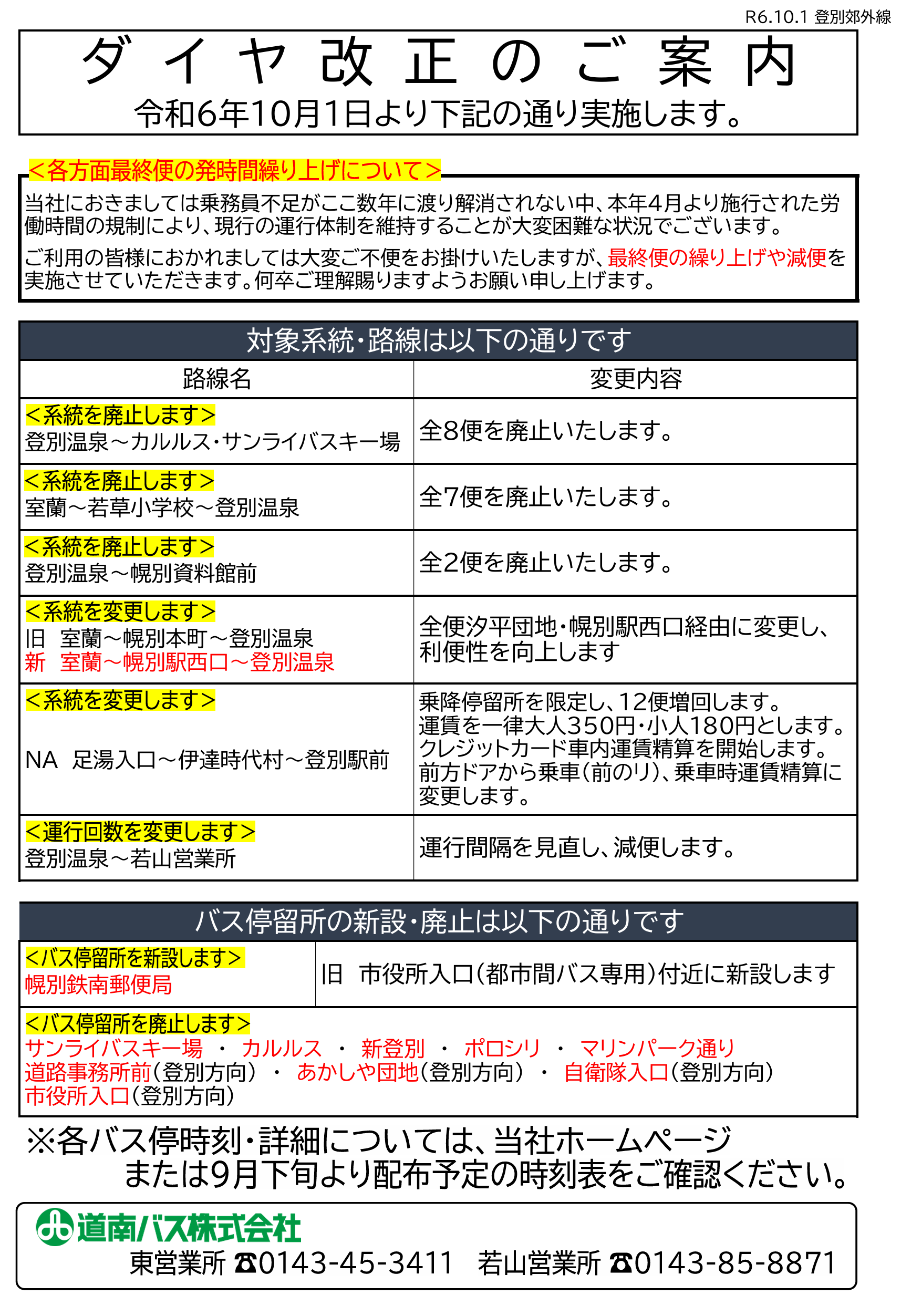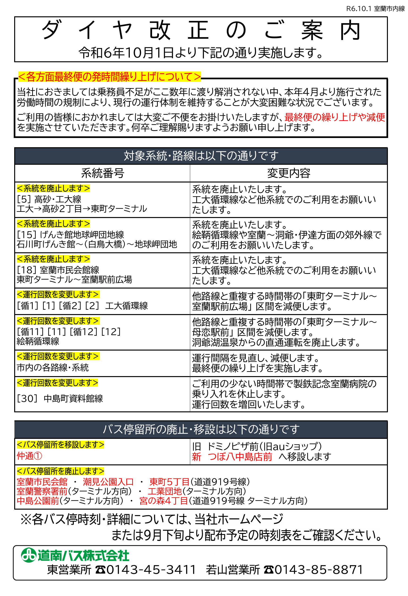 令和6年10月1日 室蘭市内線および登別管内の郊外線にてダイヤ改正を実施いたします。 詳細は下記をご覧ください。 10月1日からの系統別時刻表はこちらからご確認いただけます。 10月1日からの室蘭市内線バス停時刻表はこちらからご確認いただけます。 10月1日からの郊外線バス停時刻表はこちらからご確認いただけます。