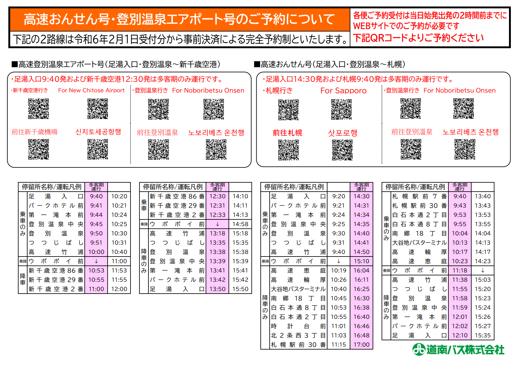 令和6年2月1日より、高速おんせん号および高速登別温泉エアポート号は全てWEBサイトでの事前決済予約制となります。 電話による予約受付は令和6年1月31日をもって終了いたしますので、あらかじめご了承ください。