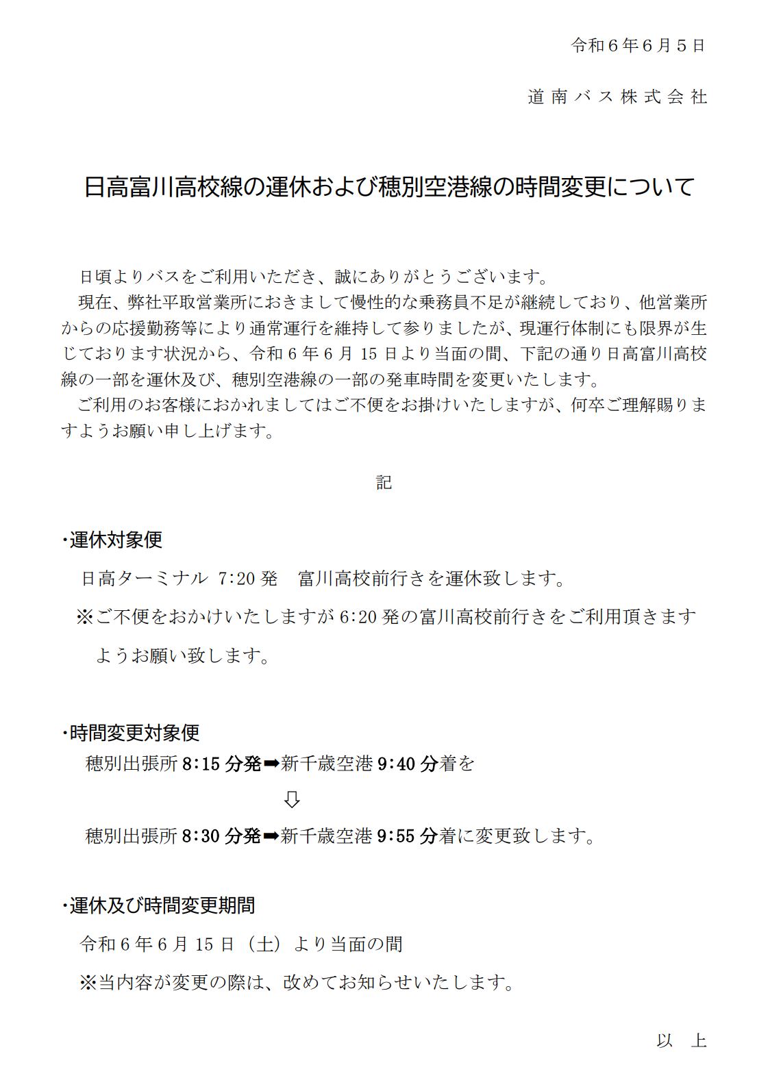 R6.6.15~ 日高富川高校線の運休および穂別空港線の時刻変更について