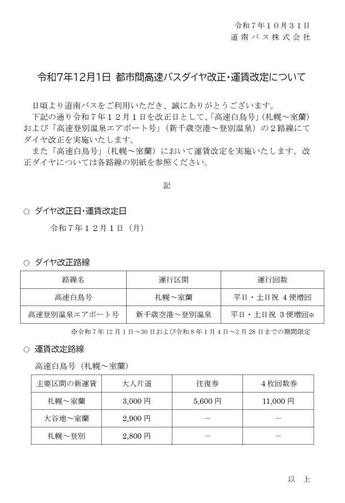 令和7年12月1日を改正日として、高速白鳥号(札幌~室蘭)および高速登別温泉エアポート号において運行回数の変更を実施いたします。 また高速白鳥号においては運賃改定も併せて実施いたします。 詳細は下記をご覧ください。