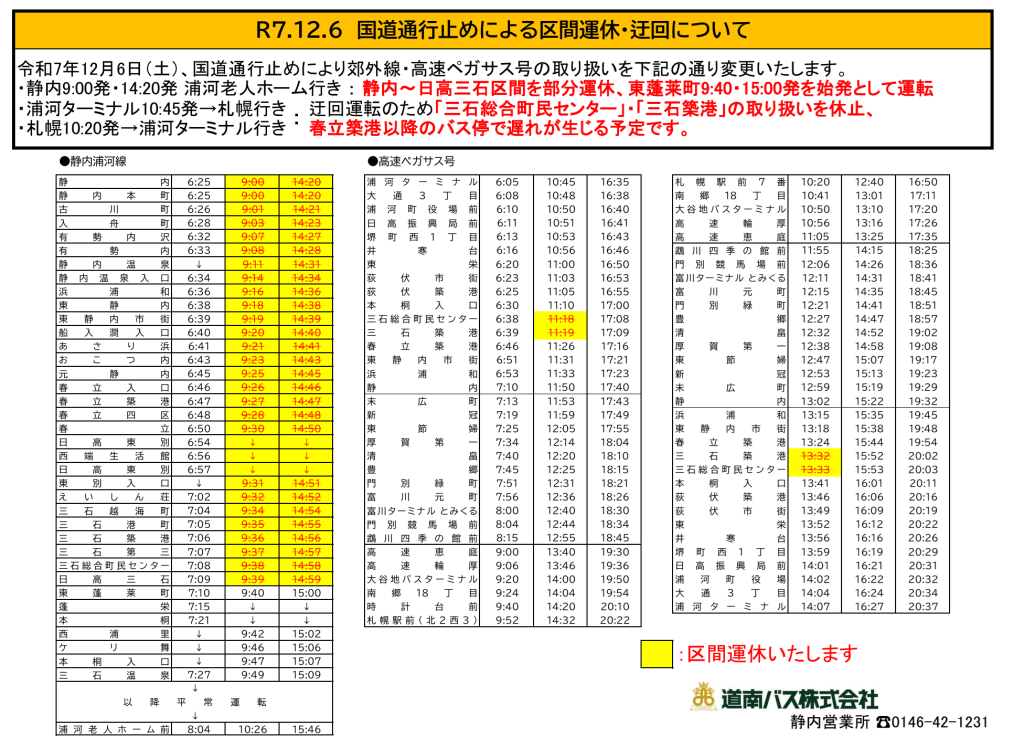 令和7年12月6日(土)、国道235号線の通行止めにより新ひだか町三石地区で区間運休を実施いたします。