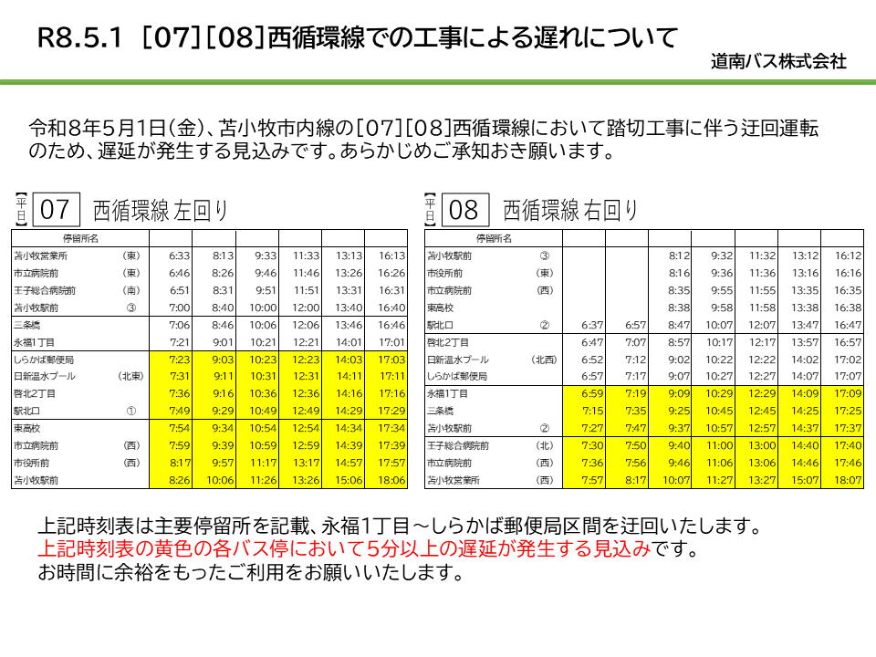 令和8年5月1日(金)苫小牧市内線の[07][08]西循環線において踏切工事に伴う迂回運転のため